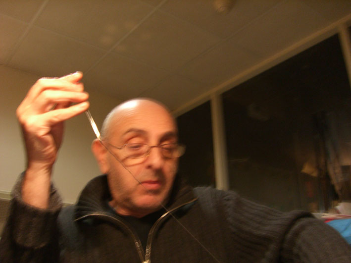 Pour revenir sur ma pièce… c’est toute l’histoire de votre oncle que j’ai imprimé sur papier, puis, découpé lettre par lettre, puis enfilé les lettres une par une à la suite, formant ainsi une histoire complète, tenant le long d’un fil ténu, suspendue mais… impossible à lire !